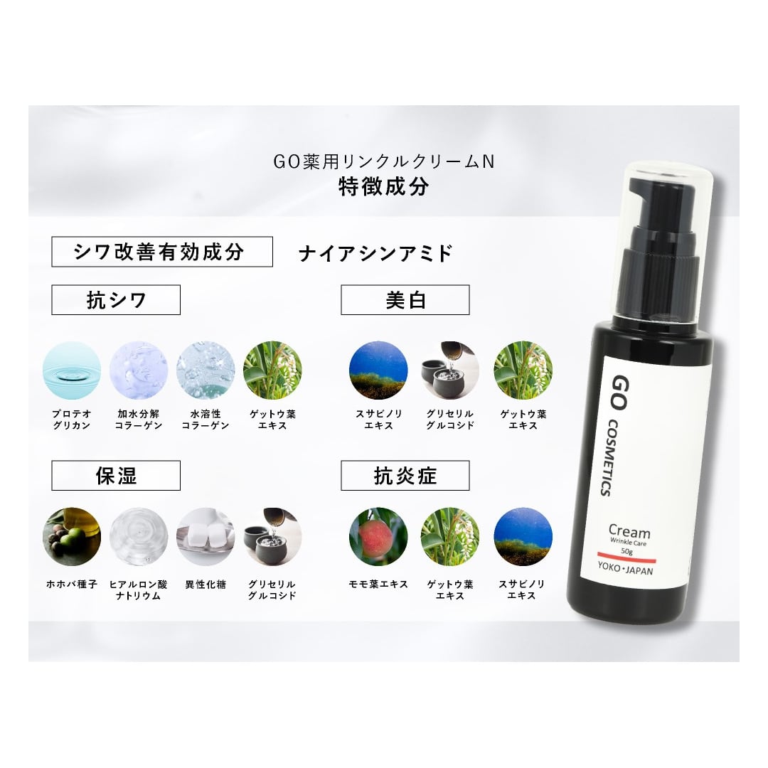 GO COSMETICSの薬用クリームは、30代以降の肌悩みに最適なアイテムです。ナイヤシンアミドが、しわやシミを軽減し、肌を明るく保湿します。さらに、乾燥から肌を守り、一年中安心してお使いいただけます。